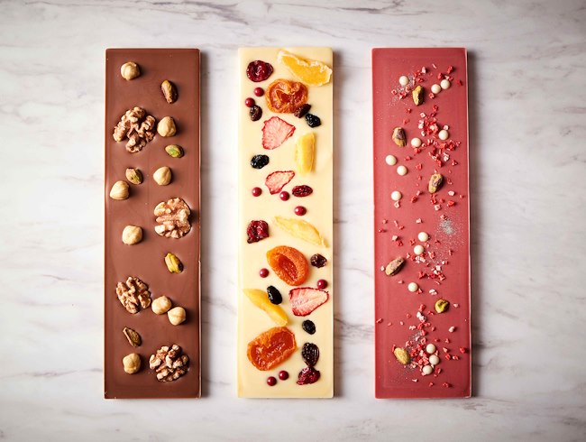3種のチョコレートバー(ストロベリー、ホワイト&フリュイ、ミルク&ナッツ)は、素材の個性をそのまま閉じ込めた上質な一枚。見た目も味わいも華やかで、手土産にもふさわしい仕上がりです。